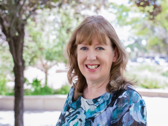 Diane Barber Stine stands in front of the Colorado Springs Pioneers Museum