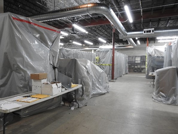 First, the CSPM collections team prepared for construction and assessed the potential impact on artifacts housed in the collection storage facility. Collection and preservation are a crucial part of the CSPM’s mission. It was important for the CSPM Registrar, Caitlin Sharpe, to determine these steps before moving forward with the construction process. Artifacts were relocated to other locations in the offsite storage facility that were not impacted by construction. Staff wrapped artifacts and shelves with protective sheets to keep them safe from dust and debris due to construction.Â