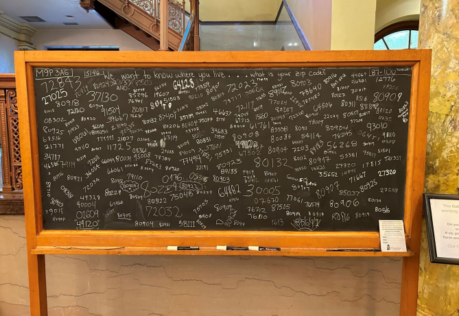 The CSPM staff is always interested to learn more about our visitors so we can better engage them. This past summer we asked visitors to self-report their home zip code. Of course, we had our own unique way of engaging the public. We placed a blackboard in our main lobby near the elevator and encouraged people to write in their home zip codes. People loved the tactile experience of writing on a chalkboard! The board would fill up in only a few days.