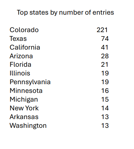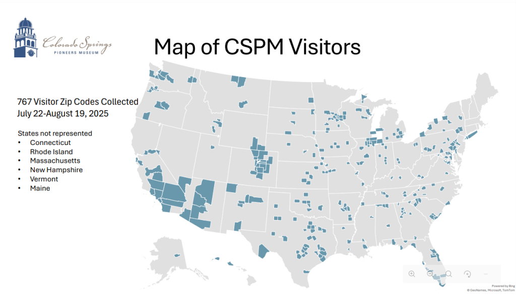 What did we learn from this? We collected data from mid-July through mid-August. At the start of each week the board would be refreshed. During that four-week period, we collected 767 valid U.S. zip codes plus a number of additional international locations and postal codes. Not surprisingly, Colorado was the top location with 29% of the entries. Among the other top responses were Texas, California, Arizona, Illinois, Florida, and Pennsylvania. These states represented 26% of responses. A total of forty-four states were represented. The only states not included in this sampling were Connecticut, Rhode Island, Massachusetts, New Hampshire, Vermont, and Maine. Clearly, Colorado Springs needs a marketing initiative in New England! We plan to revisit this data collection effort next summer.