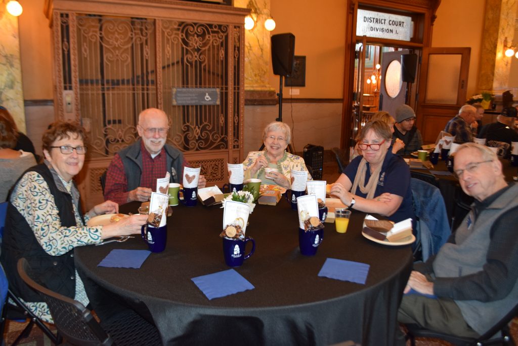A group of five volunteers gather in the restored Division I Courtroom in the Colorado Springs Pioneers Museum.
