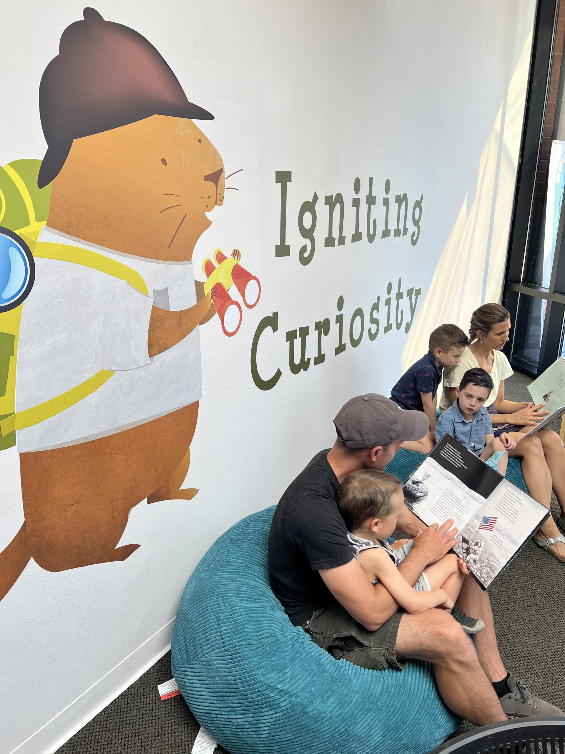 These students were not the only ones to visit the CSPM Annex. Over the 10 months the Annex has been open, many visitors have explored the exhibits, read books on cozy beanbags in the MakerSpace, participated in a variety of CSPM programs, and even struck a pose at the “I Am COS” mural, painted by local artist Jeresneyka Rose, also known as Rizzo.