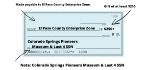 Donate by check and make it payable to El Paso County Enterprise Zone. In the memo, note Colorado Springs Pioneers Museum and the last four digits of your SSN.