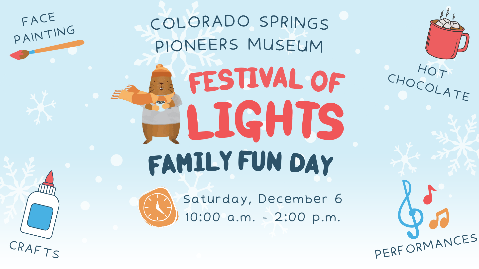 Families are invited to experience the joy of the season at the Colorado Springs Pioneers Museum’s annual FREE holiday celebration! Before heading to the downtown parade, join us for our Festival of Lights Family Fun Day from 2:00 to 6:00 p.m. Enjoy musical performances, creative crafts, face painting, and a host of family-friendly activities. As the evening approaches, warm up with delicious hot chocolate and cookies, served right outside the museum’s entrance starting at 6:00 p.m. Don’t miss this beloved tradition that has added a touch of magic to the Pikes Peak region for 40 years!